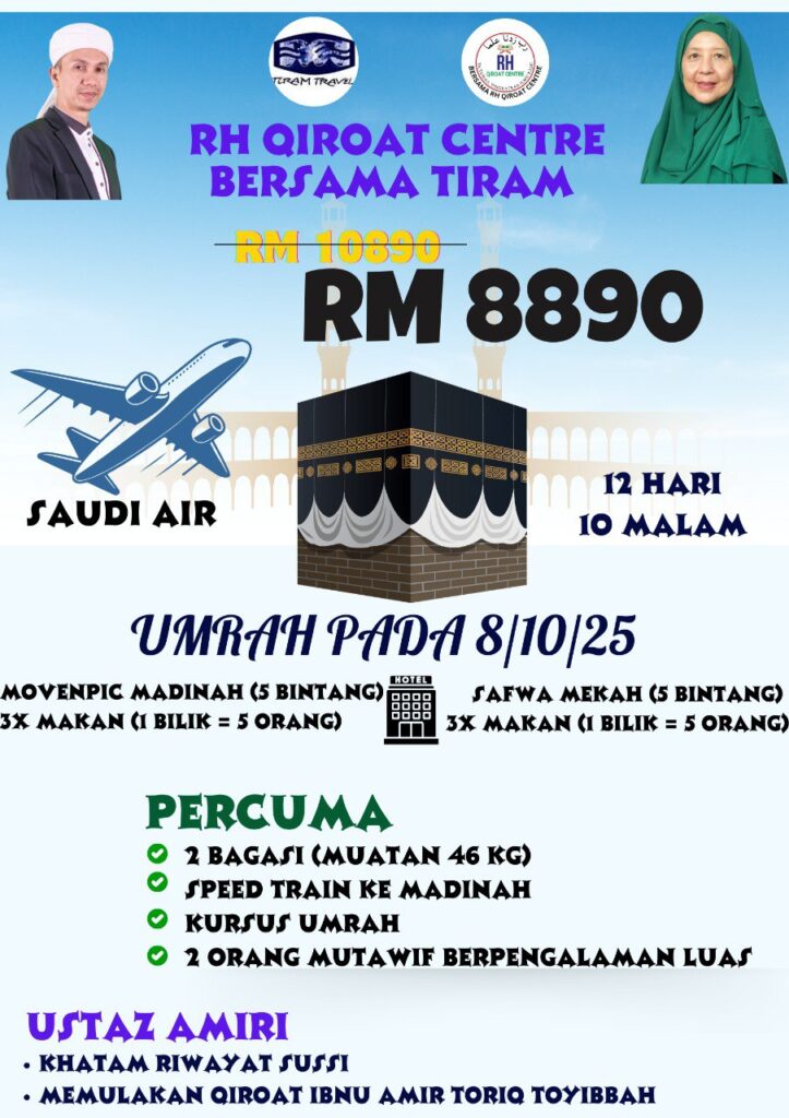 RH Qiroat Centre bekerjasama dengan pihak Tiram Travel bagi membuka peluang kepada semua warga untuk menyertai program Umrah anjuran bersama RH Qiroat Centre.