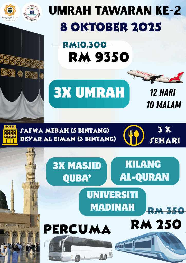 Marilah bersama menyertai pakej Umrah ke-2 yang akan bertolak pada 8 Oktober 2025.