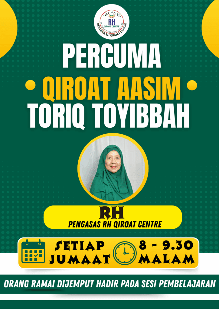 RH Qiroat Centre membuka kelas Percuma bagi Qiroat Aasim Toriq Toyibbah yang bermula pada 13 Jun 2025. Kelas ini akan diajarkan oleh RH dan akan diadakan pada: