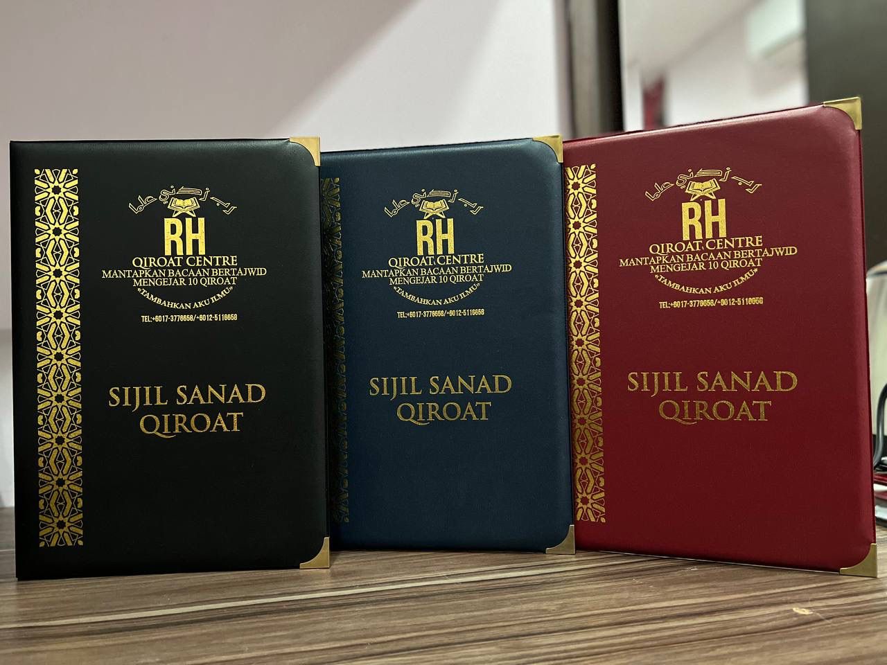 Fail ini biasanya diberikan kepada pelajar-pelajar RH QIROAT CENTRE bagi yang menamatkan 30 juzuk al Quran dan menerima sijil bersanad bersama fail / folder ini. Datang nya dalam 3 ke 4 warna sahaja. Ia berlambangkan logo RH QIROAT CENTRE dan boleh digunakan untuk kedua-dua belah fail / folder itu. Cantik untuk di miliki bagi kegunaan harian.